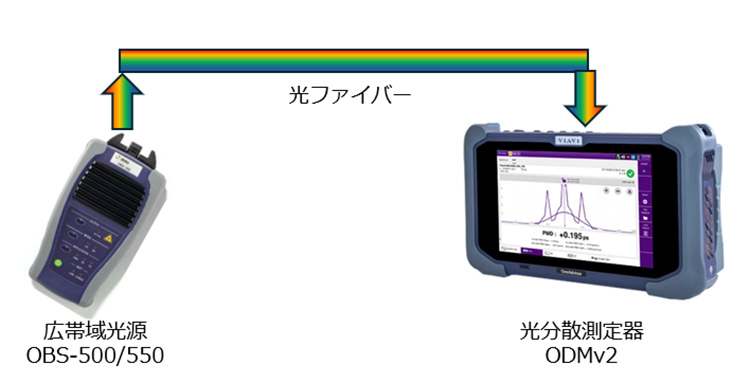 高速大容量なネットワークを構築する波長多重区間の光ファイバーに両端に、広帯域光源と光分散測定器を接続して測定します。